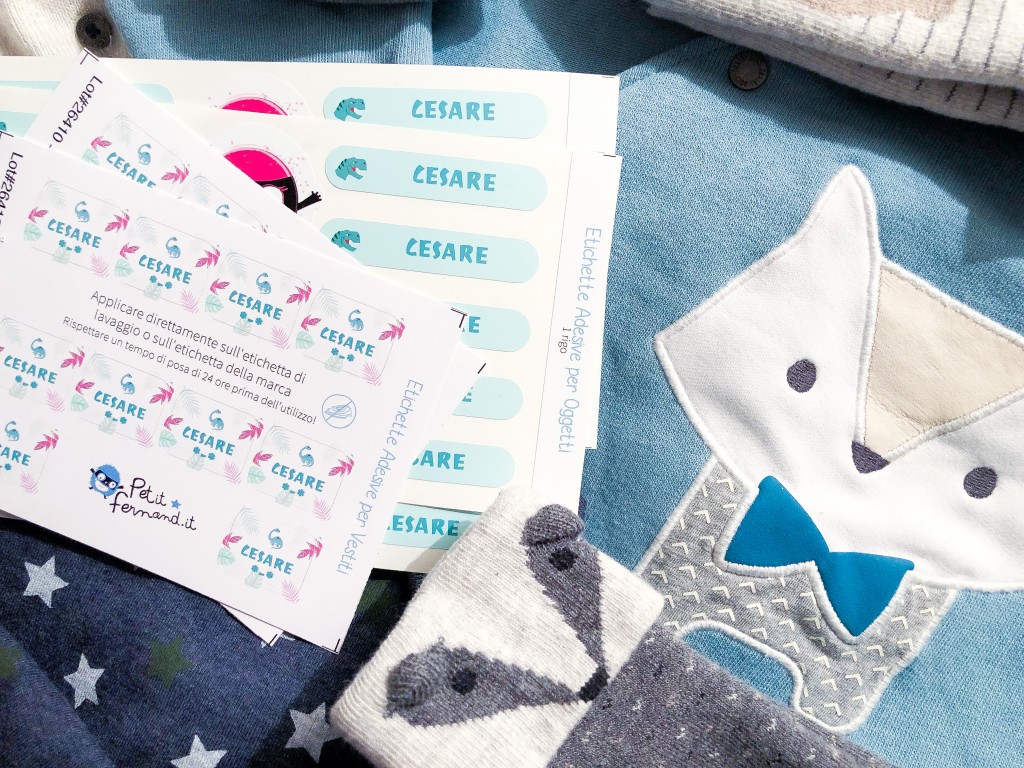 Ho chiesto qualche informazione a un po’ di mamme di Instagram che seguo con gioia e, visto che l’inizio del nido incombeva, ho deciso di fare un tentativo con Petit-Fernand, un sito specializzato nella stampa di etichette personalizzate di diversi tipi. Ci sono le etichette con nome termoadesive – che si attaccano ai vestiti con il ferro da stiro – e quelle adesive e basta – che vanno appiccicate, in un’inception di etichette, alle etichette degli indumentini. Quelle del colletto, per capirci. O, in alternativa, quelle con le indicazioni sulla composizione del tessuto e sul lavaggio. Visto che sono estremamente pigra e inetta, mi sono immediatamente orientata sulle etichette adesive, che promettevano di resistere in lavatrice fino a 60° (giro in asciugatrice compreso) e si potevano riempire di coccosità tipo piccoli dinosauri, sfondini pastello e font tondeggianti.