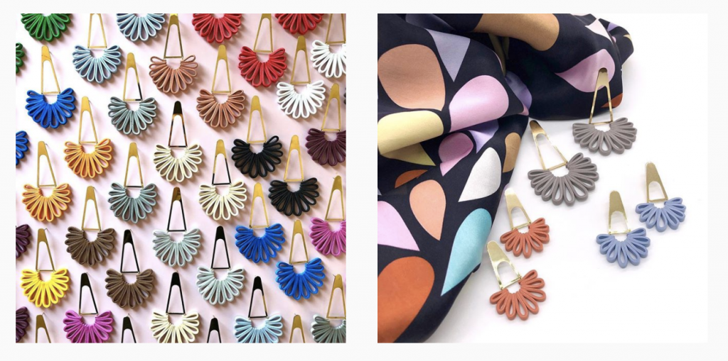 Gli orecchini voluminosi sono pesanti? Non necessariamente. Il cavallo di battaglia di Malvina sono gli Airone, in ottone e ventaglietti di gomma crepla – un materiale leggerissimo, resistente e potenzialmente assai colorato.