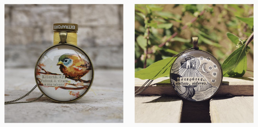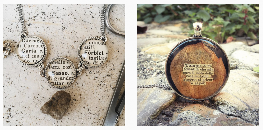 Vecchi dizionari o libri di scuola destinati al macero vengono recuperati per creare dei monilini parola-centrici. Ogni pezzo è unico ed è il risultato di un’esplorazione iconografica e testuale. Vastissimo fascino: io ho CHIMERA.