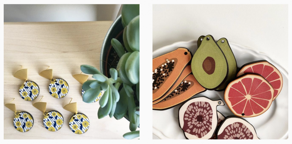 Volete appendervi una monstera alle orecchie? Ora si può. Silvia disegna tutte le grafiche dei suoi gioielli, stampa su una miscela di legno di recupero e taglia al laser. Si va dai pattern alle invenzioni più strambe.