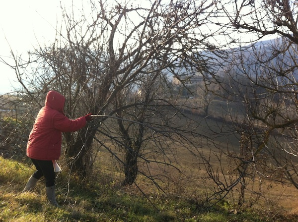 Quel che MADRE sta facendo, con dieci gradi sottozero e nessun tipo d’utensile, è la pulizia preventiva dell’albero d’amarene. Eliminare i rami secchi è molto utile: rende l’albero più comprensibile e solido, migliorandone di molto la struttura in vista della bella stagione. Meno rami secchi, arrampicate più agevoli, più amarene raggiungibili, più marmellata.