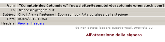 A parte il look ARTY BORGHESE – che è, per una figlia di papà coi pantaloni macchiati di vernice e un fazzoletto in testa? Per una signora ricca che si diverte a farsi mantenere mentre dipinge patacconi senza speranza? È un incoraggiamento all’acquisto aspirazionale dedicato al target proletario? -, ci avete mandato una newsletter, non un invito a palazzo. Che bisogno c’è di specificare “all’attenzione della signora“? Cosa pensano, che qua abbiam tutte la cameriera Esmeralda che ci controlla la posta in arrivo?