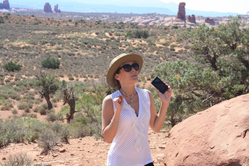 Una Tegamini travolta dall’entusiasmo al cospetto dell’immotivata Balanced Rock.