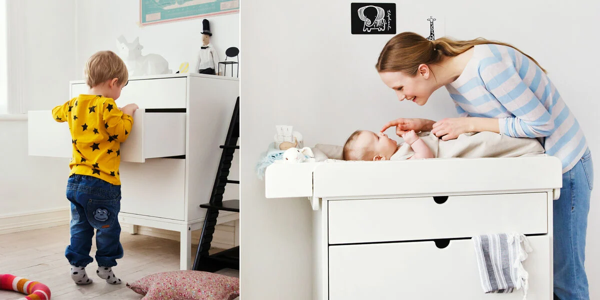Per quanto riguarda la cassettiera-fasciatoio, noi ci siamo trovati bene perché ci cambi e ci vesti sopra il bambino senza doverlo mollare lì per andare a frugare in un armadio. Mettevamo i pannolini nel primo cassetto, gli indumentini negli altri e le varie lozioni nello scomparto laterale del fasciatoio. È capiente? Non sembra, ma molto. Cesare ha un armadio suo da circa un mese ma fino ai cinque anni abbiamo usato quella cassettiera per tutti i suoi vestiti.